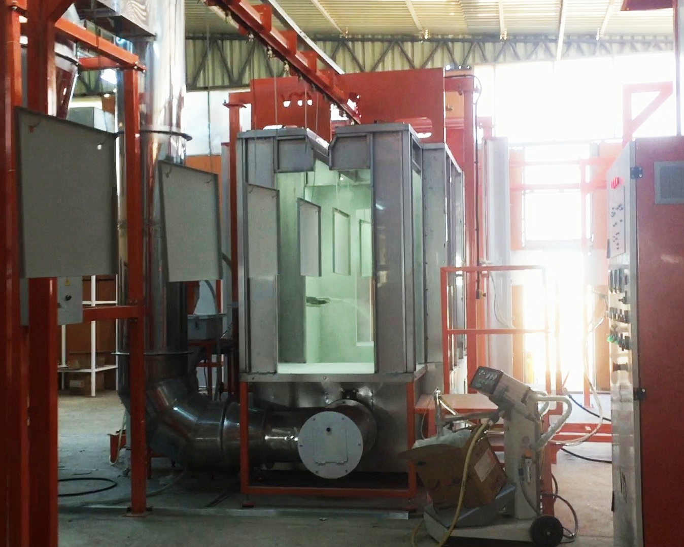 Toz boya kabini, otomatik ve manuel toz boya uygulamasına uygun kapalı toz boya kabini, siklon ünitesi ve art filtre sisteminden oluşmaktadır. Havalandırma hareketi ile hareket eden toz boya partikülleri hava kanallarını kullanarak siklona girer ve sürtünme ve yerçekimi kuvveti sonucu siklonun alt tarafında toplanır. Toz geri dönüşümü, elek ve PLC ünitesi tarafından kontrol edilen pnömatik valf sisteminden oluşan siklon altı geri dönüşüm ünitesi ile sağlanmaktadır.